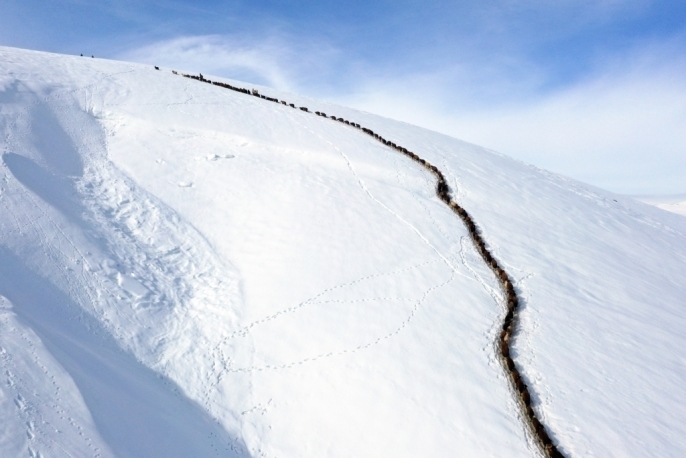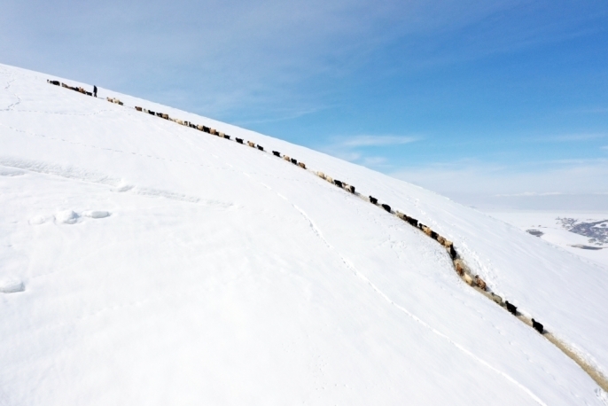 Hayvanlarının ihtiyaçlarını karşılamak için gün boyunca yoğun bir çaba harcayan besiciler, tüm zorluklara rağmen sürülerini sağlıklı bir şekilde beslemek için her gün aynı güzergahı kullanarak yolculuklarını sürdürüyorlar. Karlı dağlarda tek sıra halinde ilerleyen hayvan sürülerinin zorlu yolculuğu, dronla görüntülenerek kaydedildi. Besicilerden Felit Akbaş, son yılların en zorlu kışlarını yaşadıklarını ifade etti.