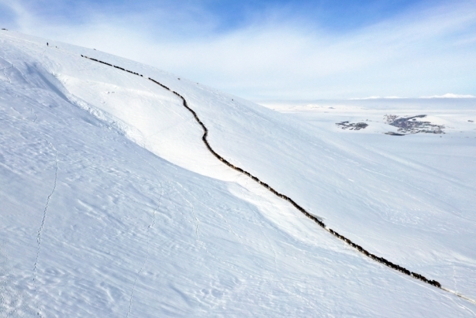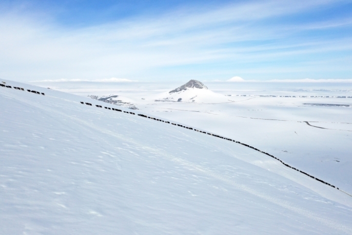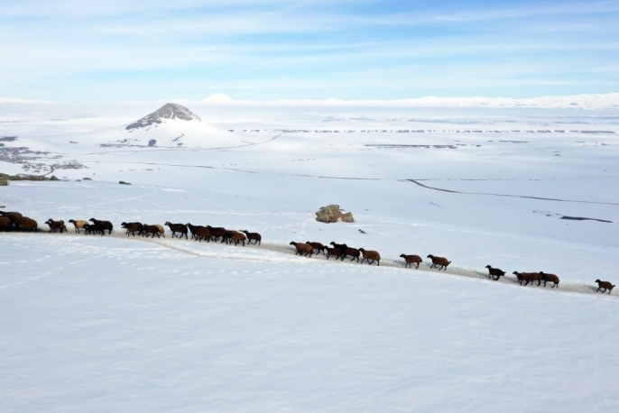 Ağrı'nın yüksek rakımlı mezralarında yaşayan besiciler, küçükbaş hayvanlarını karlı dağlar arasında "tek sıra" halinde beslenme alanlarına götürmekte.