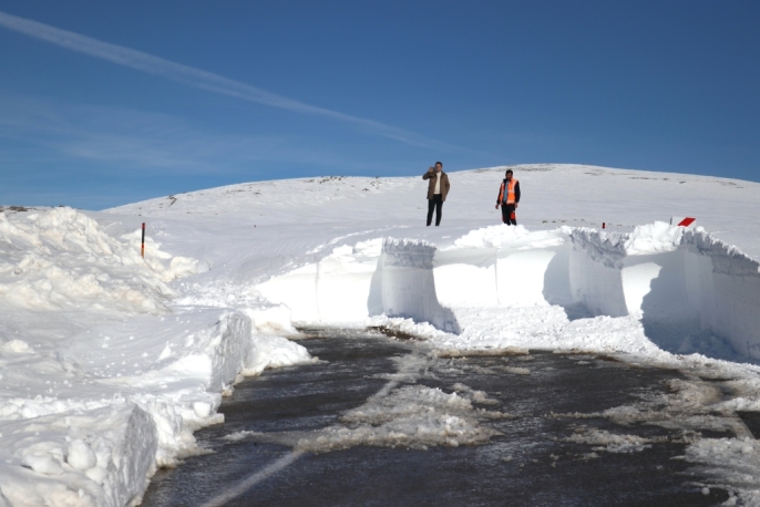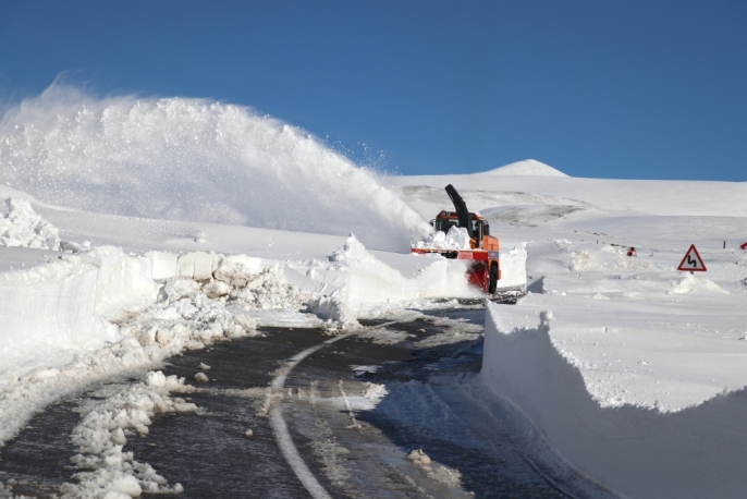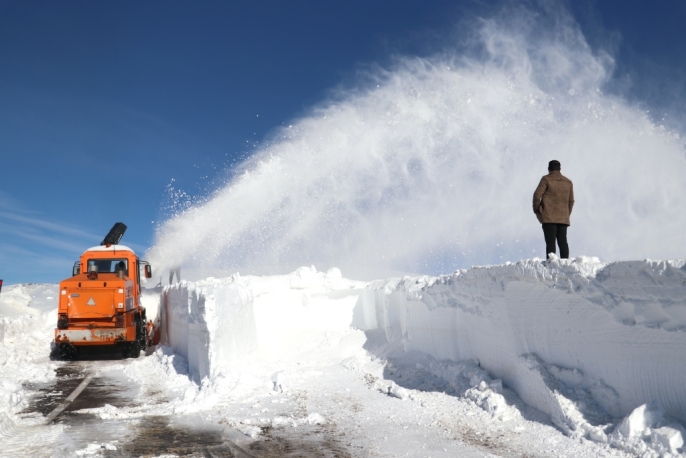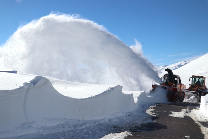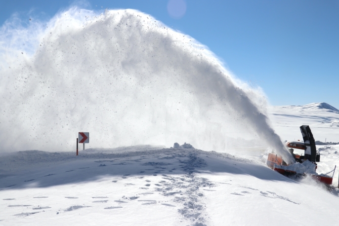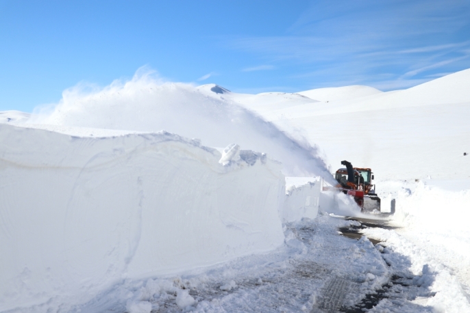 Ağrı'da Karayolları ekipleri, kar kalınlığının yer yer 2-3 metreyi aştığı Ağrı-Kağızman kara yolunda yoğun bir çalışma yürütüyor.