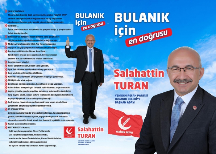Başkan Turan YRP Partisinden neden aday olduğunun sorusuna ise şu yanıtı verdi: Gerçek belediyecilik, Sosyal belediyecilik , kültürel belediyecilik, ekonomik belediyecilikte ehil bir tabip edasıyla neşter vurmaya talibim. Buda ancak ve ancak Milli Görüş belediyeciliği ile mümkündür.” dedi.