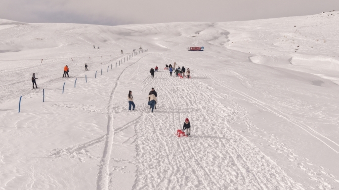 Van'ın Çaldıran ilçesindeki Termal Kayak Merkezi, kar kalınlığının yeterli seviyeye ulaşmasıyla kayak tutkunu çocukları ağırladı. Aileleriyle birlikte merkeze gelen çocuklar, kayak takımları ve kızaklarla kayarak eğlenceli vakit geçirdi.
