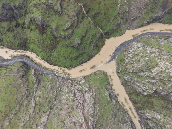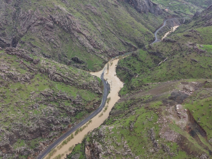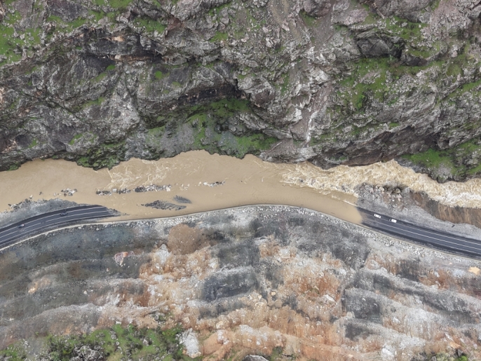 Hakkari'de, etkili olan sağanak yağışlar sonucu derenin taşması, Şemdinli-Derecik kara yolunun bir bölümünü su altında bıraktı.
