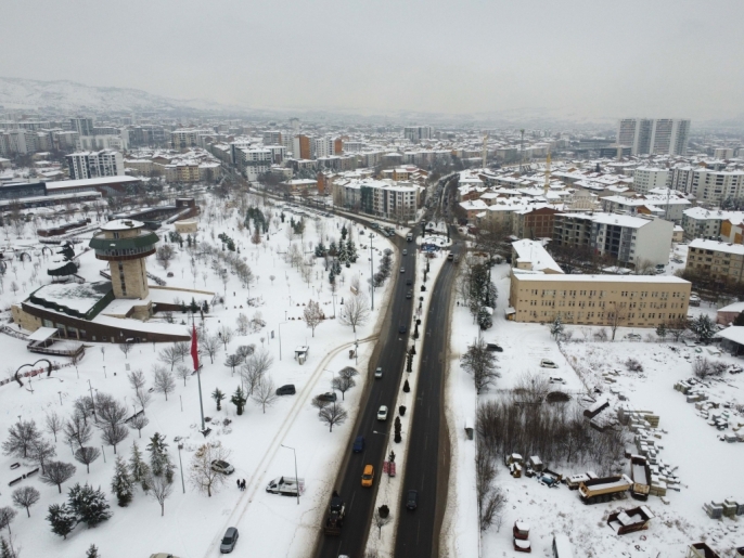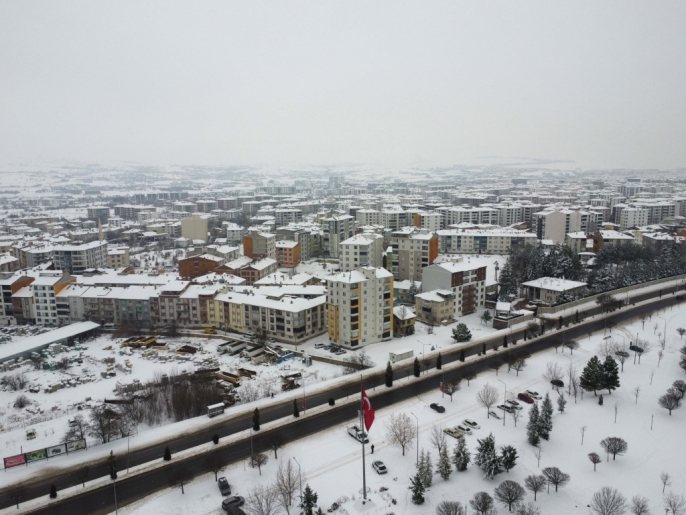 Elazığ'da etkili olan yoğun kar yağışı, şehri adeta beyaza bürüdü. Kent merkezinin bu kış manzarası, dron ile havadan çekilen görüntülerle kaydedildi.