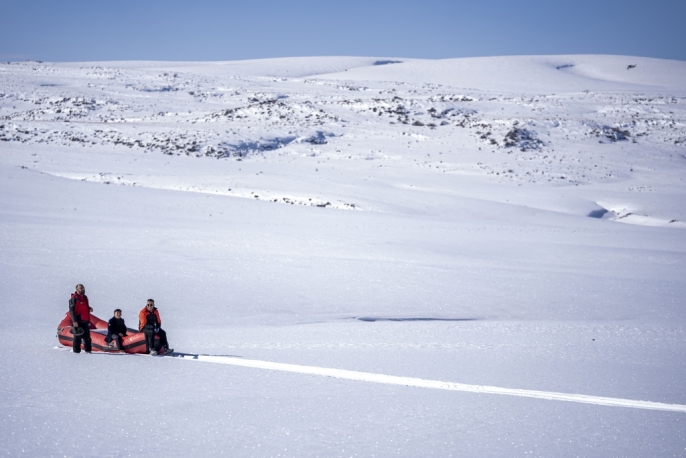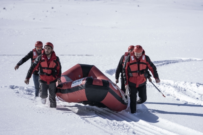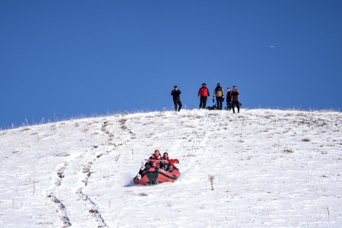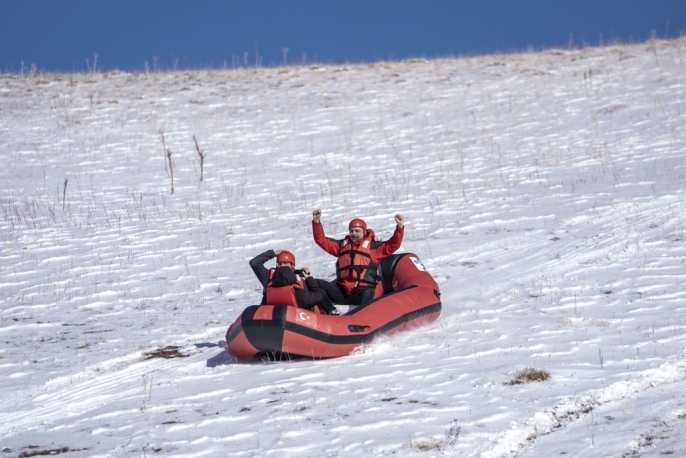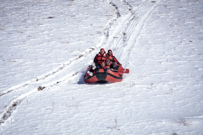 Erzurum'da karlı dağları aşan maceraseverler, hayvanlara yem bırakıp 'kar raftingi' yaptı