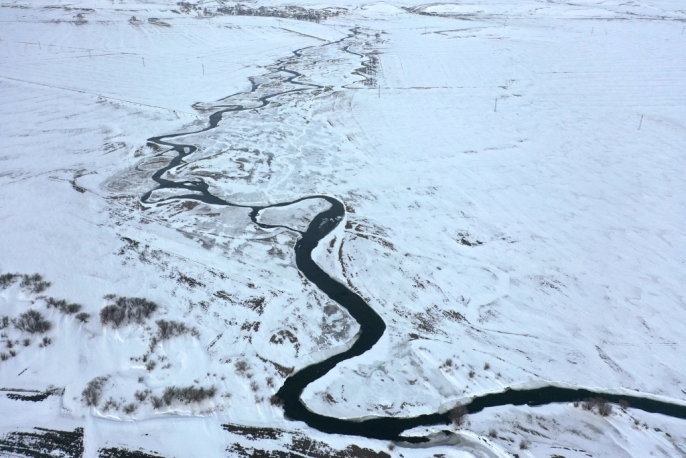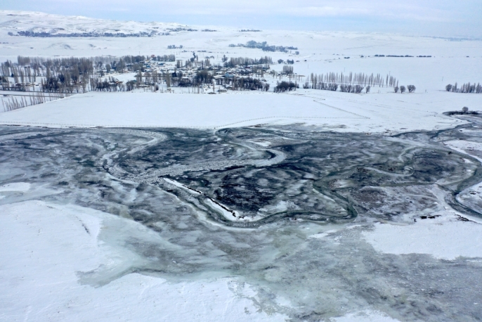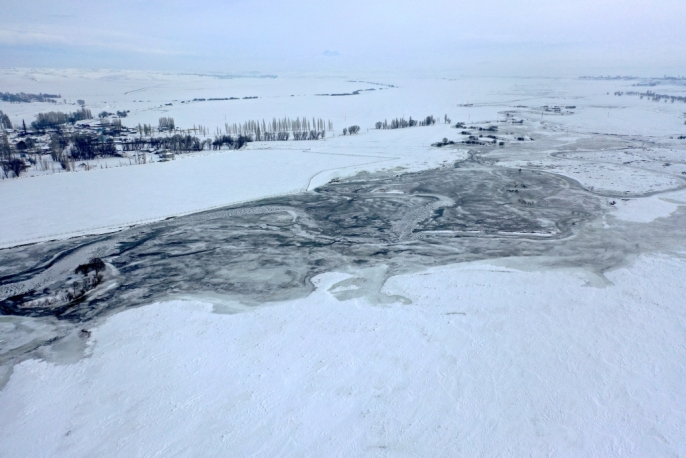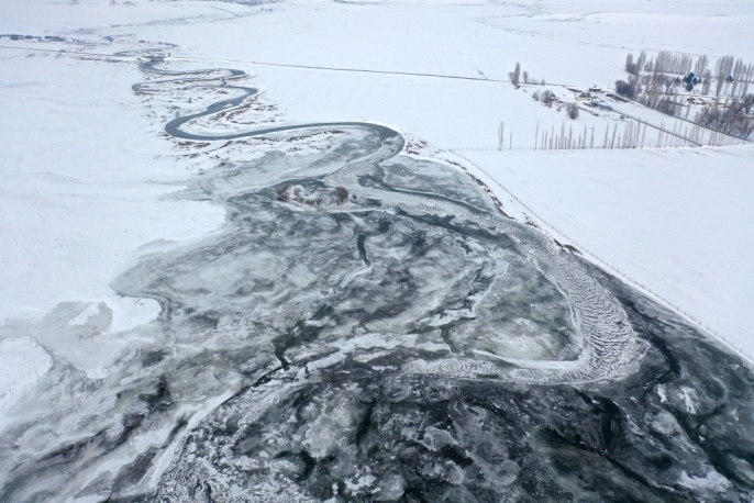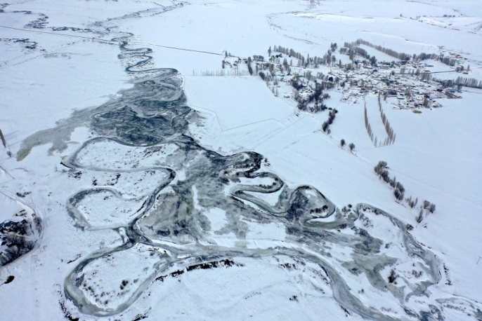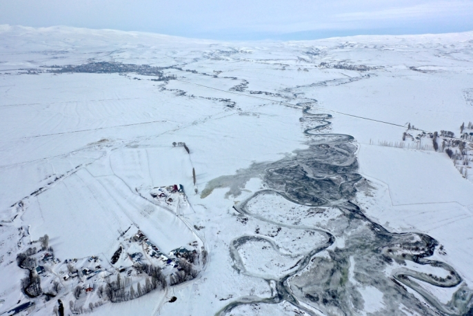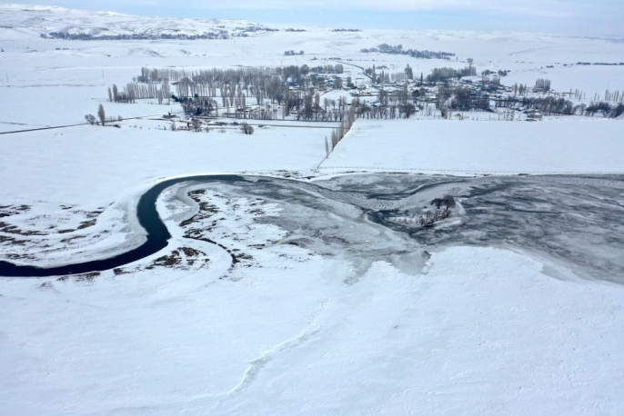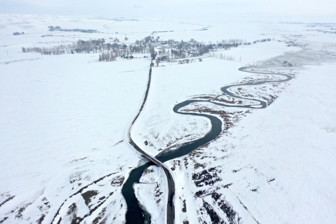 Kars'ta karın beyaz örtüsü altında kalan köyler ve donan menderesler dronla görüntülendi