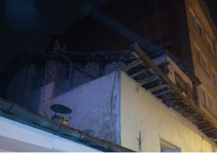 Pazarcık ve Elbistan merkezli 6 Şubat'taki 7,7 ve 7,6 büyüklüğündeki depremlerin büyük yıkıma neden olduğu Malatya'nın Battalgazi ilçesine bağlı Aslanbey Mahallesi'nde bulunan ağır hasarlı bir binanın çatısı, yan tarafındaki başka bir ağır hasarlı müstakil evin bahçesine yıkıldı.