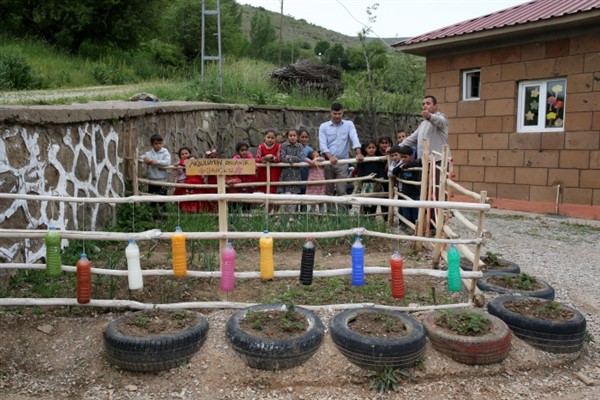 Bitlis'in Güroymak ilçesine bağlı Çayarası köyünün Akbulut mezrasındaki ilkokulda görevli öğretmenler, öğrencileriyle araba lastiklerinden çiçeklik ve ahşaptan yaptıkları kuş yuvalarıyla okulun dış duvarlarını ve çevresini renklendirdi.