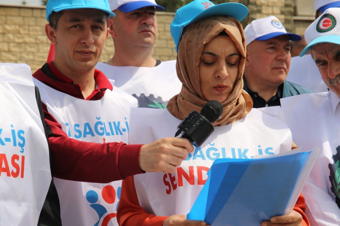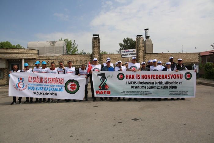 ALPARSLAN DİYARI- Muş Belediye meydanında bir araya gelen sendika üyeleri adına basın açıklamasını okuyan Öz Sağlık-İş Sendikası temsilcisi Elif Şahin, HAK-İŞ'e gönül veren ve emeği için var gücü ile çalışan emekçilerin 1 Mayıs Emek ve Dayanışma Günü'nü kutladı.