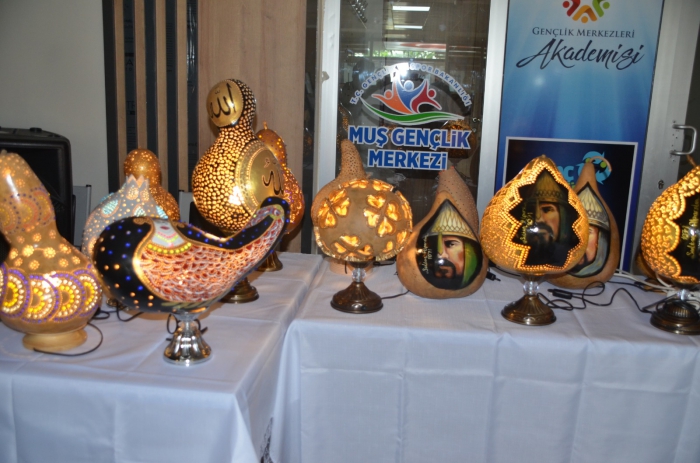 Muş Gençlik Merkezi Müdürlüğü bünyesinde açılan fotoğrafçılık, resim, yağlı boya, ebru, tezhip, minyatür, su kabağı işlemeciliği ve ahşap boyama kurslarında gençlerin yaptığı ürünler beğeniye sunuldu.
