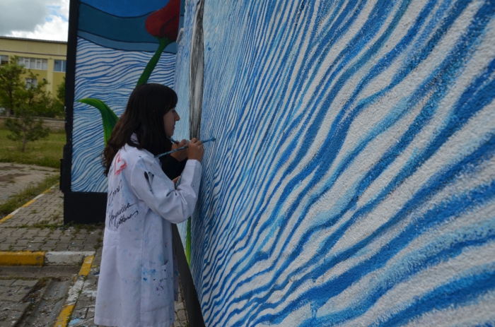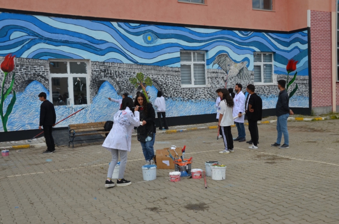 ALPARSLAN DİYARI- Muş Şehit Yücel Kurtoğlu Güzel Sanatlar Lisesi öğrencileri öğretmenlerin desteğiyle, sosyal sorumluluk projesi kapsamında okulun duvarına, Muş lalesi, telli turna, Sultan Alparslan ve tarihi Murat Köprüsü'nün resimlerini çizerek boyadı.