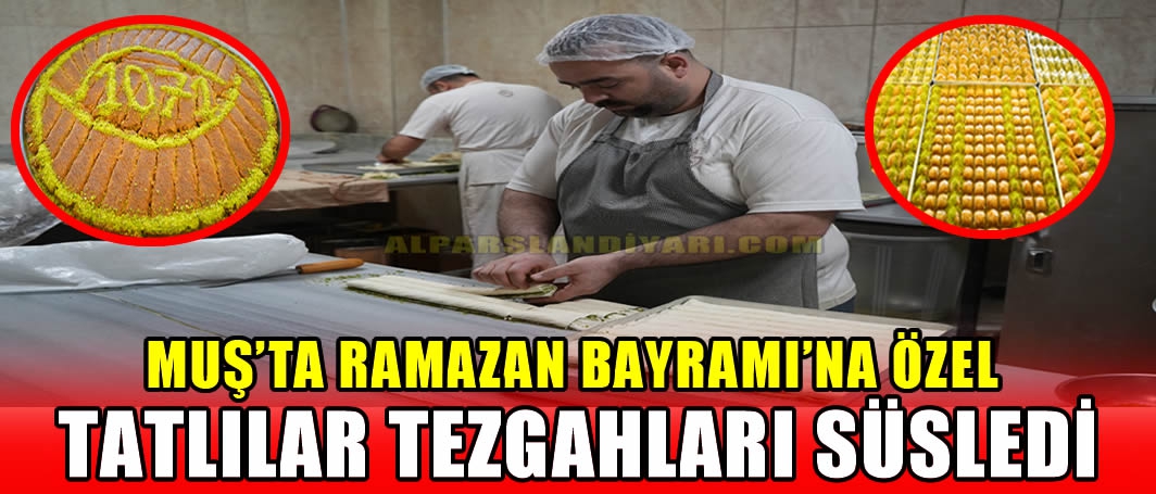ALPARSLAN DİYARI-Muş'ta Ramazan Bayramı öncesi çeşit çeşit baklavalar tezgâhları süslerken, bir işletmeci ise Anadolu’nun Türklere vatan olduğu 1071 Malazgirt zaferinden dolayı bu bayramda 1071 tepsi tatlı yaptı.