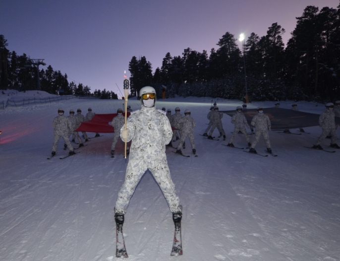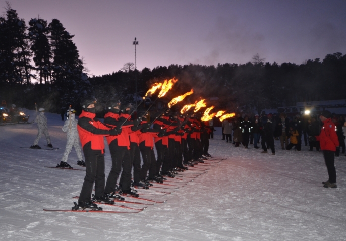 Sarıkamış Kayak Merkezi'nde düzenlenen etkinlikte, Çanakkale'deki 57. Alay'a ithafen Sarıkamış'ta konuşlanan 57. Komando Taburu'nda görevli komandolar ve JAK timleri, ellerinde Türk bayrakları ve Atatürk posterleri taşıyarak meşalelerle zirveden aşağıya kaydı.