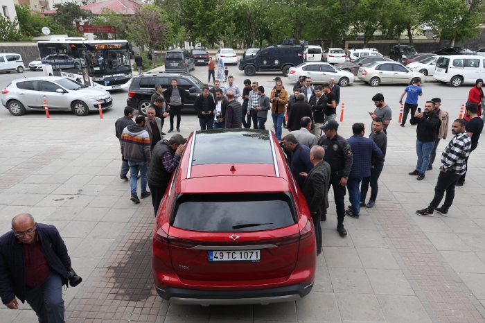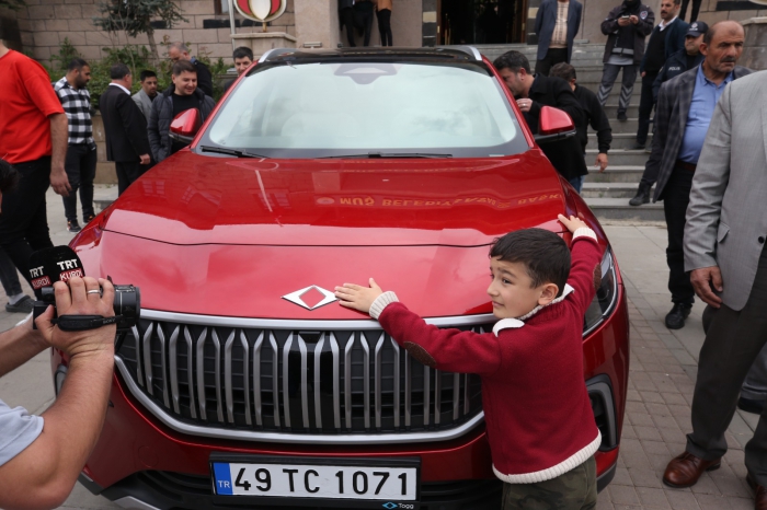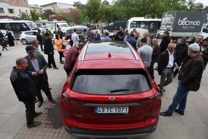 Daha sonra belediye önünde tanıtılan 49 TC 1071 plakalı "Anadolu kırmızısı" rengindeki Togg'a, vatandaşlar yoğun ilgi gösterdi, cep telefonlarıyla fotoğraf çekti.