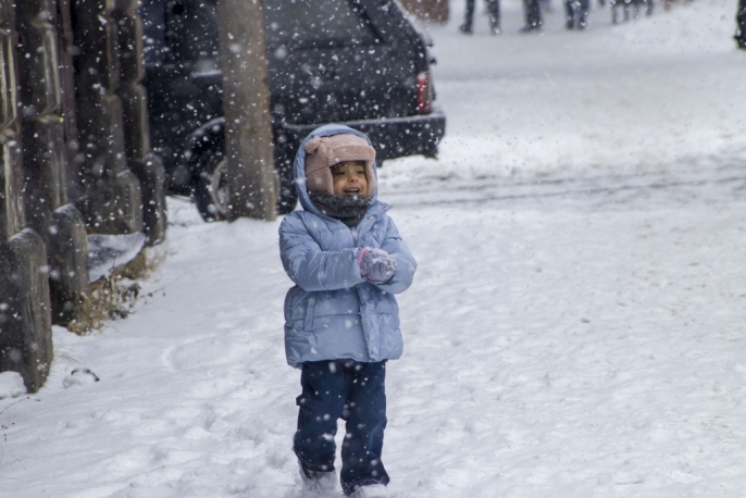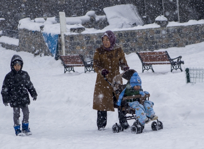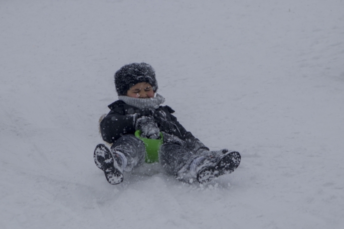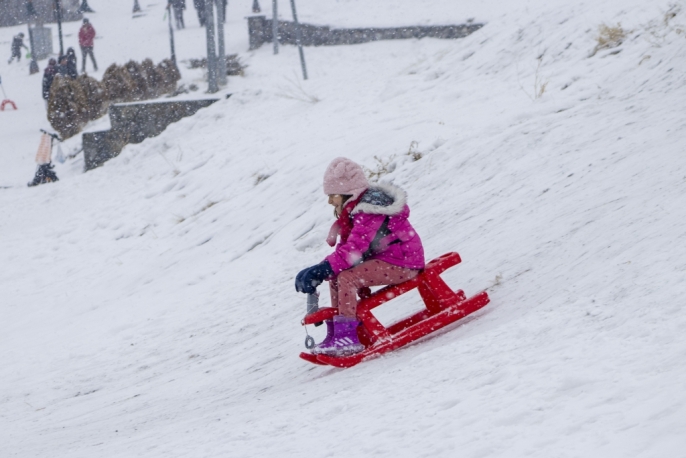 Kars kent merkezi, etkili olan kar yağışının ardından beyaza bürünürken, çocuklar yarıyıl tatilinin son gününde kızak keyfi yaşadı.
