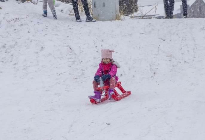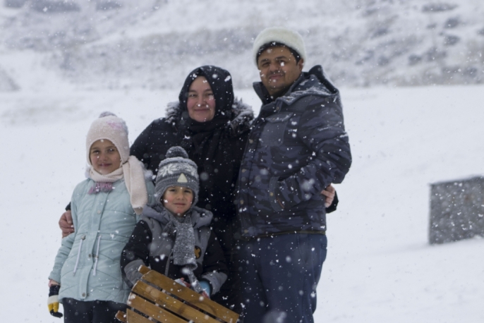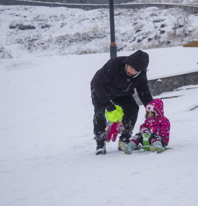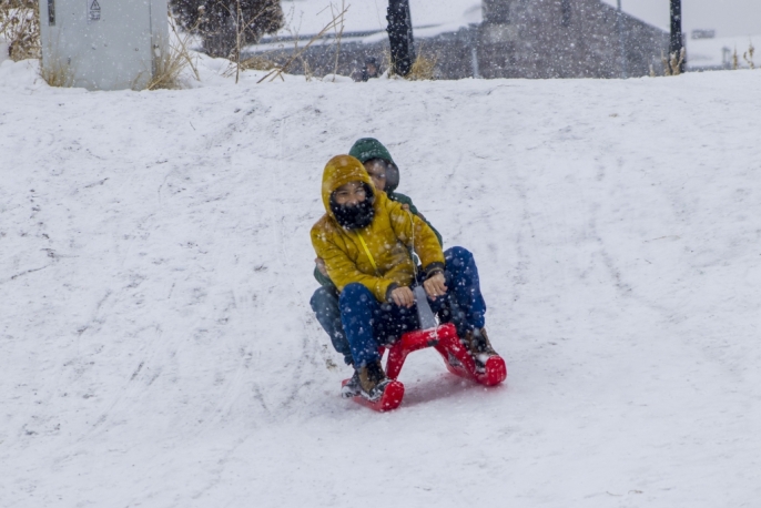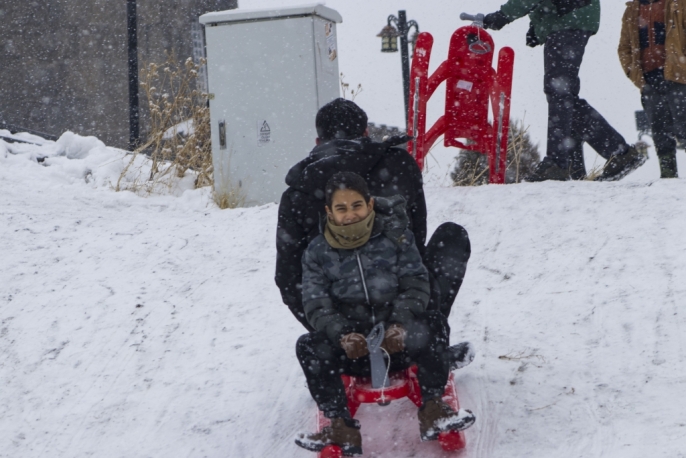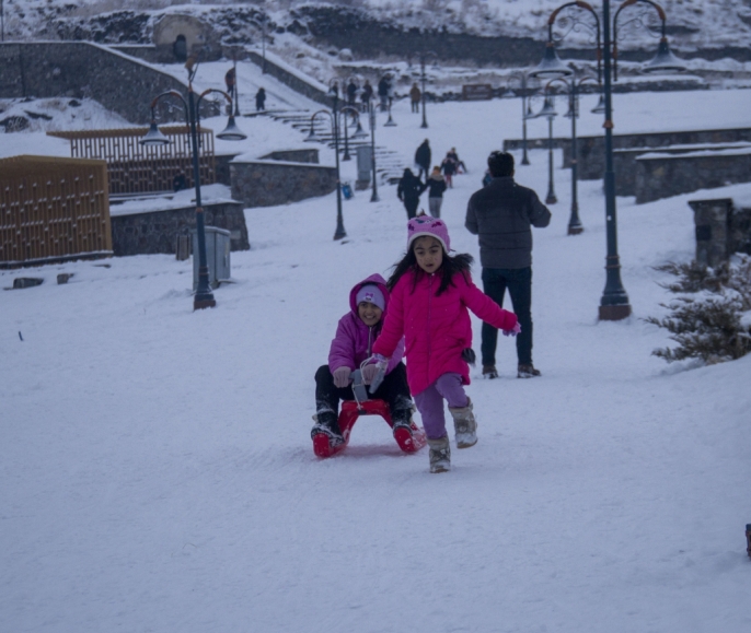 Kentte dün başlayan ve aralıklarla devam eden kar yağışı, özellikle çocukları sevindirdi. Aileler, yarıyıl tatilinin son gününü fırsat bilerek çocuklarıyla birlikte karla kaplı yamaçlarda kızak kaymanın tadını çıkardı. Kars Kalesi etekleri, neşe dolu anlara sahne oldu.