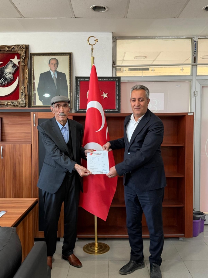 ALPARSLAN DİYARI- İleri yaşına rağmen siyasi duruşunu ve devletine olan bağlılığını gösteren Ömer Dede’nin üyelik başvurusu, ilçe başkanlığında duygusal anlara sahne oldu. Üyelik işlemlerinin ardından konuşan Ömer Dede, MHP Genel Başkanı Devlet Bahçeli’ye teşekkür ederek, “Allah ondan razı olsun” dedi. Ömer Dede, birlik ve beraberliğe vurgu yaparak, “Bu ateşin üstüne bir daha yanmamak için su döküyorum” sözleriyle barış, huzur ve devletin bekasına olan temennisini dile getirdi.