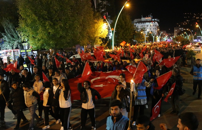 Ellerinde Türk bayrakları ve meşalelerle mehter takımı eşliğinde İstasyon Caddesi'nden Millet Bahçesi önüne kadar yürüyen vatandaşlar, birlik ve beraberlik mesajları verdi.