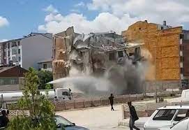 Elazığ’da Kahramanmaraş merkezli depremlerde ağır hasar alan 5 katlı binanın yıkımı sırasında iş makinelerinin yanı sıra ses dalgalarından da faydalanıldı. Binanın belirli noktalarına korna sesi ile destek verilirken iş makinelerinin müdahalesi ve ses dalgalarının etkisiyle 5 katlı bina yıkıldı.