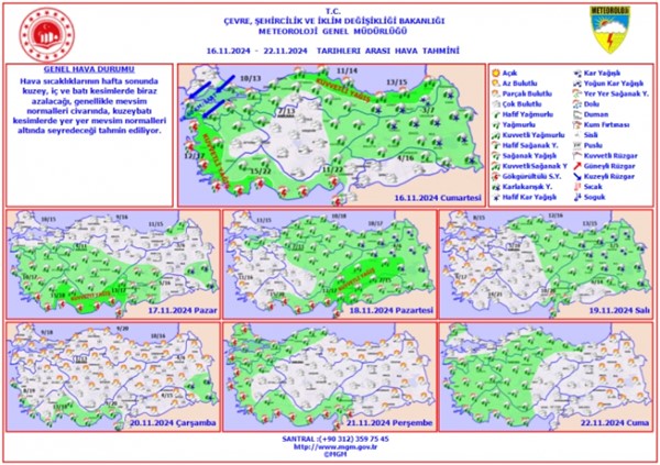 Meteoroloji Genel Müdürlüğü tarafından yapılan son tahminlere göre yurdun büyük bölümünün parçalı ve çok bulutlu, Marmara bölge geneli, Ege'nin kuzey ve batı, İç Anadolu'nun kuzey ve doğu, Batı Akdeniz'in kıyı, Doğu Akdeniz'in İskenderun Körfezi ve Toroslar kesimleri ile (Çorum hariç) Karadeniz ve (Şırnak hariç) Doğu Anadolu Bölgelerinin yağışlı geçeceği tahmin ediliyor.