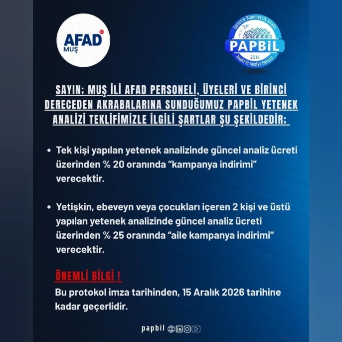 ALPARSLAN DİYARI- Yapılan protokol kapsamında; AFAD Muş İl Müdürlüğü personeli, AFAD üyeleri ve birinci dereceden akrabaları PAPBİL Yetenek Analizi hizmetlerinden avantajlı şekilde faydalanabilecek.