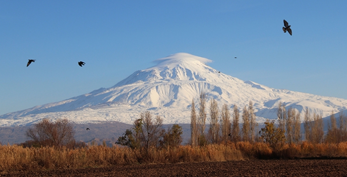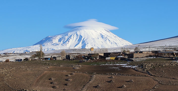5 bin 137 metre yüksekliğindeki Ağrı Dağı, yurt genelinde etkili olan kar yağışıyla zirvesinden eteklerine kadar beyaz örtüyle kaplandı. İran, Nahçıvan ve Ermenistan sınırında yer alan ve bu ülkelerden görülebilen dağın zirvesini, halk arasında "şapka" diye adlandırılan mercek bulut sardı.