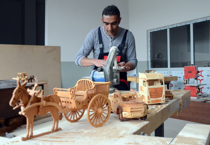 Kaymakamlık himayesinde, atölyede yardımcı hizmetler personeli olarak zanaatını yapan Demir, tahta parçalarını ince ince işleyerek süs eşyalarına dönüştürüyor.