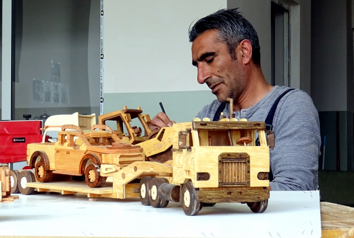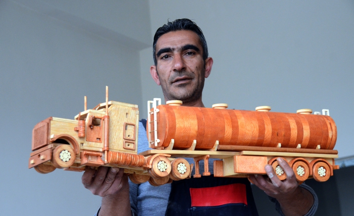 Ahşap işlemeciliğinin büyük sabır gerektirdiğini anlatan Demir, "Küçükken bıçakla tahtadan at, koyun gibi şeyler yapmaya büyüdükçe de daha değişik şeyler yapmaya çalıştım. Yaklaşık 5 yıldır bu işi daha da geliştirdim. Şu ana kadar en az 100 çeşit tır, yarış arabası, cip, kamyon gibi birçok ürün yaptım." dedi.