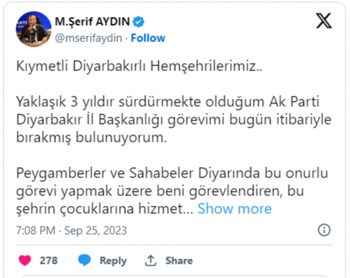 Yaklaşık 3 yıldır sürdürmekte olduğum Ak Parti Diyarbakır İl Başkanlığı görevimi bugün itibariyle bırakmış bulunuyorum.
