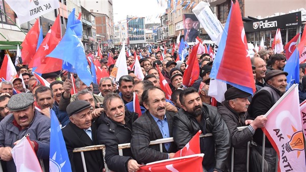 "Kemal Bey'in adaylığıyla beraber ne oldu, PKK, dağdan, Kandil'den, Suriye'den PYD, YPG, SDG, okyanus ötesinden FETÖ, avaz avaz bağırmaya başladılar. 'Millet İttifakı'nı destekleyelim, Recep Tayyip Erdoğan'ı indirelim, eyalet sistemini getirelim.' Ülkemizi bölmeye çalışanlara, kardeşliğinizi bozmaya çalışanlara, huzurumuzu, güvenliğimizi yok etmeye çalışanlara karşı Recep Tayyip Erdoğan'ı seçmeye hazır mısınız? 1. sandıkta Türkiye'nin, Kafkasların, Orta Doğu'nun, Balkanlar'ın ve Afrika'nın mağdur ve mazlum milletlerinin güvencesi, teminatı olan terörün korkulu rüyası Recep Tayyip Erdoğan'a oylarınızı verecek miyiz? Sandıkları patlatacak mıyız?"