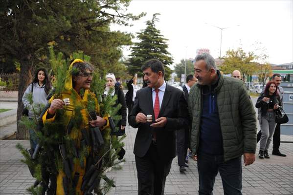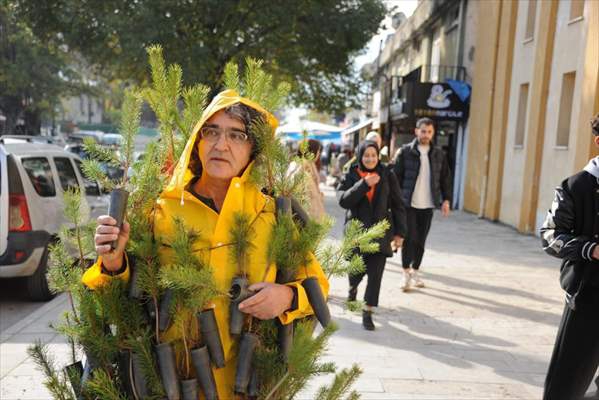 Bu kapsamda yol güzergahı üzerinde çalılar ve sonbahar renklerini bünyesinde barındıran yapraklar gibi doğada bulduğu doğal malzemeleri toplayarak alışveriş filelerinin içine dolduran Kavukcu, vücuduna tüp poşetlerinde yer alan fidanları da bağlayarak kent merkezinde gezdi.