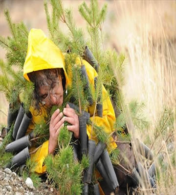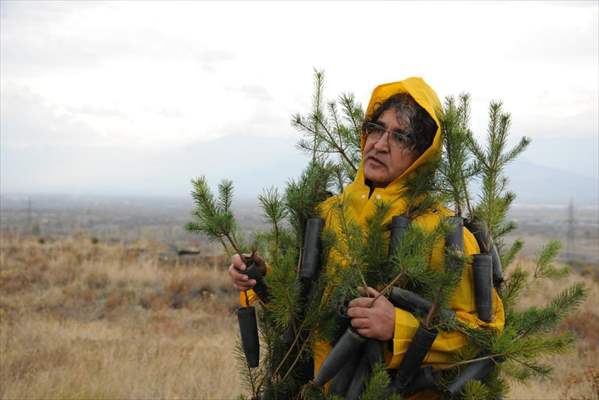 Vatandaşların dikkatli bakışları arasında ilerleyerek yerleşkedeki fidan dikim alanına giden Kavukcu'nun bedenindeki fidanlar toprakla buluşturuldu.