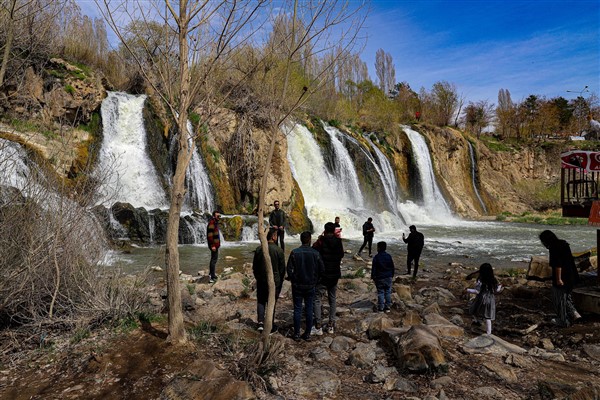 Şelaleye ve adaya akın eden ziyaretçiler, metrelerce yükseklikten akan suyun sunduğu eşsiz güzellikler ile adanın Gevaş ilçesinde bulunan karlı Artos Dağı'yla bütünleşerek oluşturduğu manzaranın keyfini çıkardı.