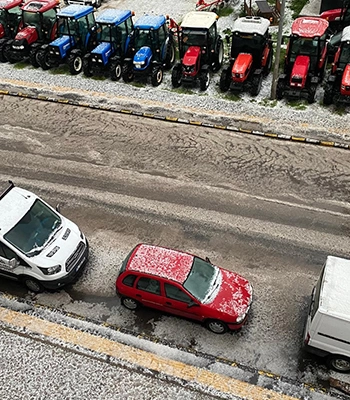 Kısa süreli yağışın ardından etraf beyaza büründü, park halindeki araçların üzeri dolu taneleriyle kaplandı.