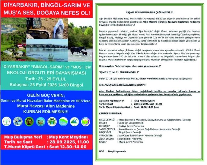 Çevre dernekleri ve platformların öncülüğünde 28 Eylül 2025 Pazar günü saat 11.00’de Muş Kent Meydanı’nda basın açıklaması yapılacak. Etkinlik, 12.30-14.00 saatleri arasında Tarihi Murat Köprüsü gezisiyle devam edecek.