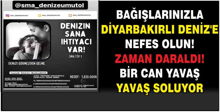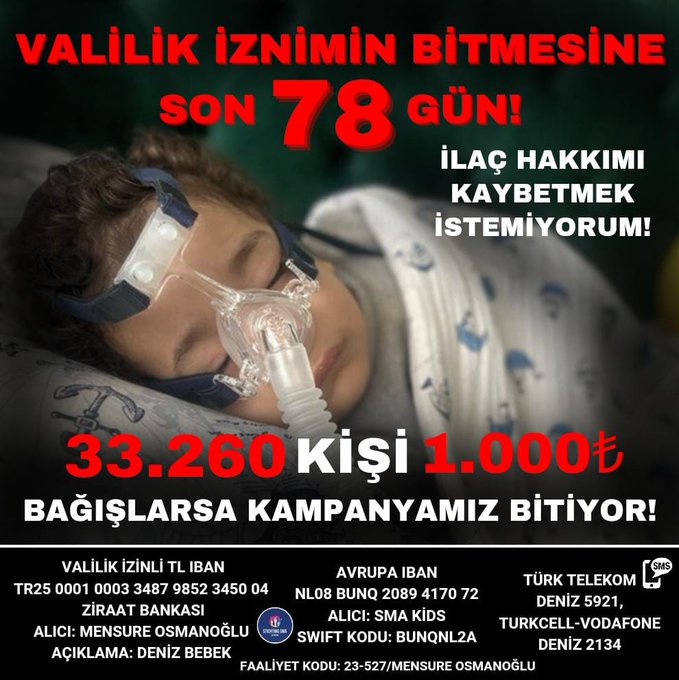 Deniz Osmanoğlu için açılan valilik izini süresi bitmek üzere, kritik 74 gün kaldı. Deniz bebek SMA Tip-1 ölümcül kas hastalığıyla savaşıyor. Bu 74 gün içinde hayırsever vatandaşların nakdi yardımları sayesinde sağlığına kavuşacak. Valilik izinli yardım kampanyasında bir süt 25 TL, bu haberi okuyan herkes 4 süt alsa Deniz bebek sağlığına kavuşacak.