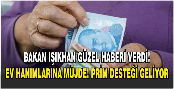 ALPARSLAN DİYARI-Ev hanımlarına, prim desteği verilmesi için çalışma başlatıldı.Çalışma ve Sosyal Güvenlik Bakanı Vedat Işıkhan, müjdeli haberi verdi. Televizyon yayınına konuk olan Bakan Vedat Işıkhan, konuya ilişkin çalışmayı başlattıklarını duyurdu.