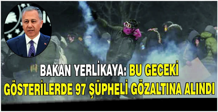ALPARSLAN DİYARI- Bakan Yerliklaya, İstanbul Büyükşehir Belediye Başkanı Ekrem İmamoğlu'nun gözaltına alınmasına ilişkin gerçekleştirilen gösterilerde bugün 'Görevi yaptırmamak için direnme' suçlarından Türkiye genelinde 97 şüphelinin gözaltına alındığını duyurdu.