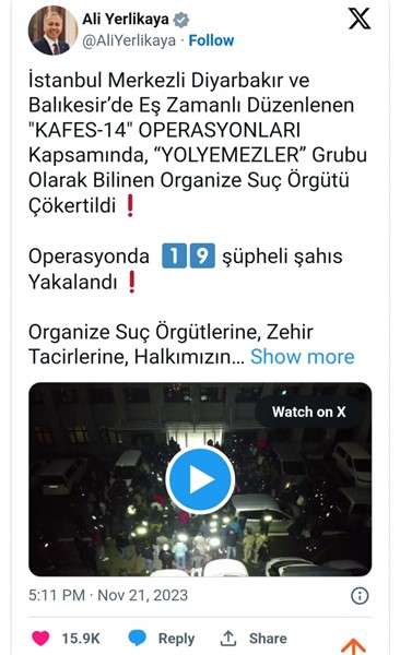 ALPARSLAN DIYARI-Yerlikaya, sosyal medya hesabından yaptığı açıklamada, İstanbul'da faaliyet gösterdiği tespit edilen "Yolyemezler" organize suç örgütünün, Bakırköy Cumhuriyet Başsavcılığının koordinesinde, İstanbul Emniyet Müdürlüğü Organize Suçlarla Mücadele Şube Müdürlüğünce, İstanbul merkezli Diyarbakır ve Balıkesir'de düzenlenen Kafes-14 operasyonuyla çökertildiğini bildirdi.