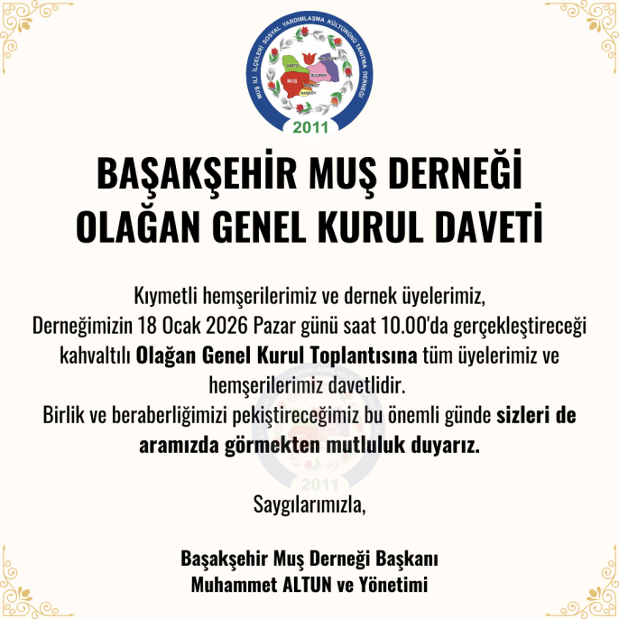 İstanbul Başakşehir'de önemli sivil toplum kuruluşlarından biri olan Başakşehir Muş Derneği, Olağan Genel Kurul Toplantısı’nı 18 Ocak 2026 Pazar günü gerçekleştirecek. Başkan Muhammet Altun, birlik ve beraberlik mesajı vererek tüm hemşerilerini kahvaltılı genel kurula davet etti.