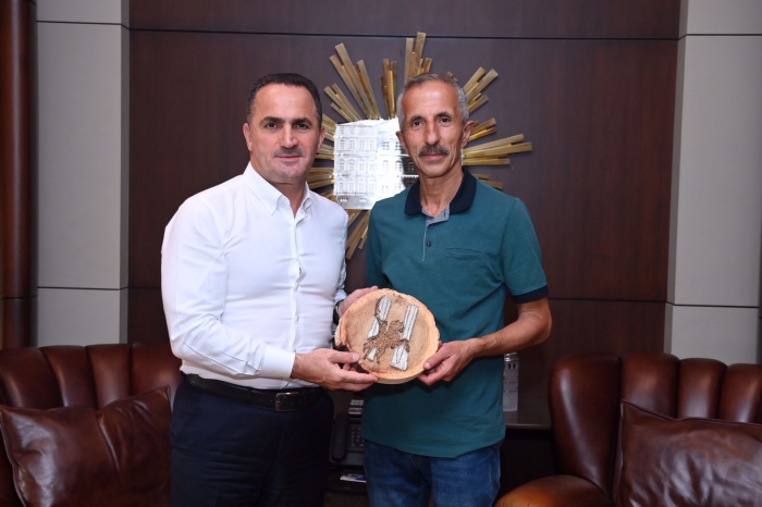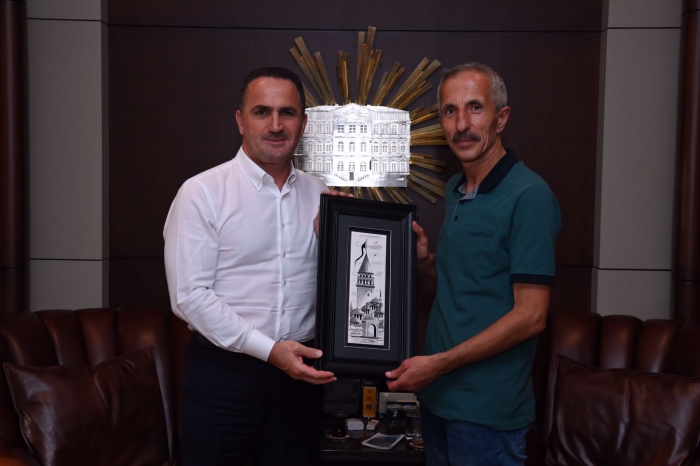 Beyoğlu Belediye Başkanı Yıldız´da Muhtar Başaran’a İstanbul´u simgeleyen minyatür Galata Kulesi hediye etti.