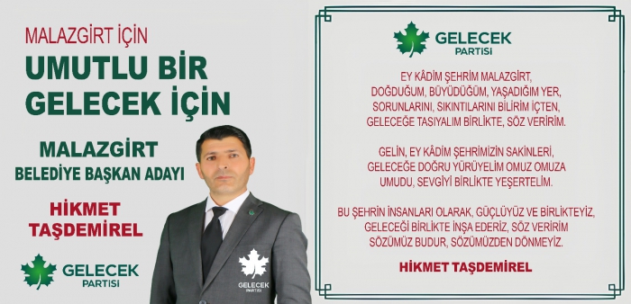 Gelecek Partisi Malazgirt Belediye Başkan adayı Hikmet Taşdemirel,”İlçede seçim çalışmalarımız çok verimli geçiyor. Halkımızın bizlerden umut beklediklerini bize inandıklarını ve halkımızın Gelecek Partisine karşı sempati ile baktığını gördük. Rabbim girdiğimiz bu yolda bizleri halkımıza karşı mahcup etmesin inşallah.” dedi.