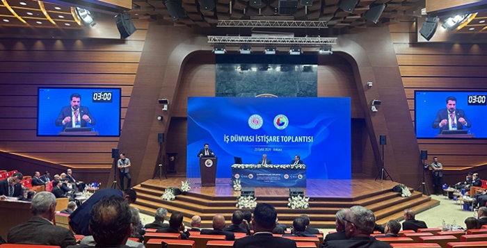 "İş Dünyası İstişare Toplantısı", Türkiye Odalar ve Borsalar Birliği (TOBB) Başkanı M. Rifat Hisarcıklıoğlu’nun ev sahipliğinde Çalışma ve Sosyal Güvenlik Bakanı Vedat Işıkhan'ın katılımıyla TOBB İkiz Kuleler Konferans Salonu'nda gerçekleştirildi.