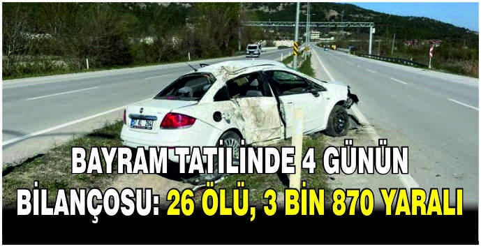 Bayram tatilinin ilk dört gününde (Cumartesi, Pazar, Pazartesi ve Salı) toplam 2 bin 453 trafik kazası meydana geldiğini belirten Yerlikaya, 26 vatandaşın hayatını kaybettiğini ve 3 bin 870 vatandaşın yaralandığını kaydetti.