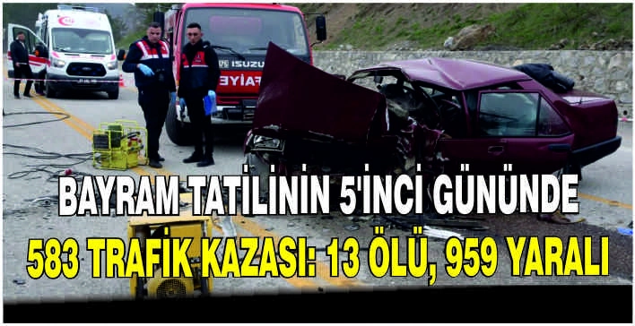 ALPARSLAN DİYARI- İçişleri Bakanı Ali Yerlikaya, Ramazan Bayramı tatilinin 5'inci gününde 583 trafik kazası meydana geldiğini, bu kazalarda 13 vatandaşın hayatını kaybettiğini, 959 kişinin de yaralandığını duyurdu.