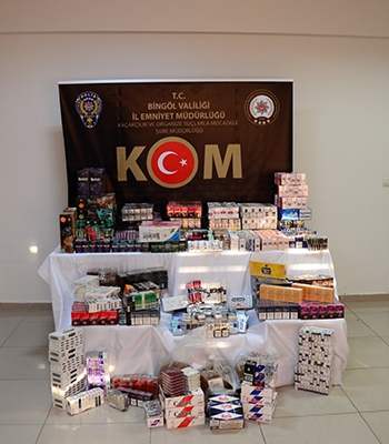 ALPARSLAN DİYARI- İl Emniyet Müdürlüğünden yapılan açıklamaya göre, Kaçakçılık ve Organize Suçlar Şube Müdürlüğünce yapılan çalışmalarla 5 bin 59 paket sigara, 34 elektronik sigara, 8 kilogram kıyılmış tütün, 212 dal puro, 16 paket pipo tütünü, 3 bin 600 dal boş makaron ve 560 doldurulmuş makaron ele geçirildi.