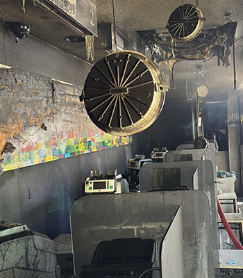 Yangın nedeniyle bankanın mobil şube tırı kullanılamaz hale geldi.