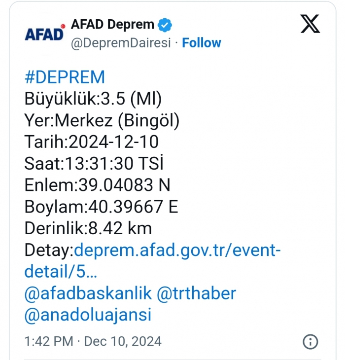 ALPARSLAN DİYARI- Afet ve Acil Durum Yönetimi Başkanlığı (AFAD), Bingöl'ün Merkez ilçesinde 3.5 büyüklüğünde deprem meydana geldiğini duyurdu.