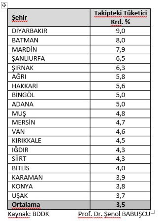 Türkiye'de kredi kullanıp takibe düşenlerin illere göre dağılımını yapan Buluşçu, "Bireysel kredilerde (taşıt, konut, tüketici) takibe düşme oranı açısından tehlike çanları tüketici kredileri için çalıyor. Geçtiğimiz hafta TCMB faiz kararına bağlı olarak çok ciddi seviyede yükselen faizler, gelecek aylarda bu gruptaki krediler için daha da ciddi seviyede tehlikeye işaret ediyor. Kredilerdeki son faiz artışları devreye girmemiş haliyle tüketici kredisinde yılın ikinci yarısı itibariyle takibe düşme oranı %3,5. Tüm iller içinde % 9 ile Diyarbakır ilk sırada. Ortalama oranın üzerinde 19 il var. 3 büyük ilin oranları: İzmir %3,3, İstanbul %3, Ankara %2,7."