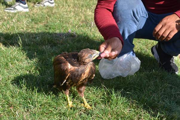 Kartal yavrusunu bitkin halde gördüğünü belirten Gezici, "Kuşa yiyecek ve su verdim. Bitkin halde olduğu için uçamıyordu. Elimden geldiği kadar baktım, İnşallah sağlığına kavuşur ve doğaya salınır." diye konuştu.