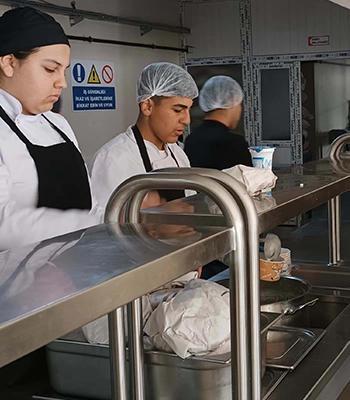 "Okulumuzdaki bu bölümde eğitim gören öğrencilerimiz yemek atölyemizde dönüşümlü olarak staj görüyor. Taşımalı sistemle köylerden veya uzak yerlerden ilçe merkezindeki okullara gelerek eğitim gören yaklaşık 600 öğrenci için her gün yemek hazırlıyoruz."